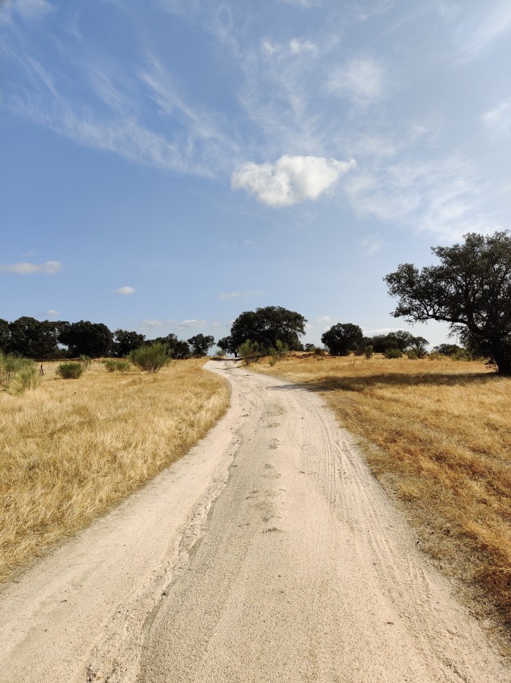 From the embalse the path took me onto a little used country road. I say little used because I managed to successfully walk down the centre of it for over half an hour without needing to move aside for any traffic. Eventually I exited from the tarmac and onto a hard packed sand track that glistened in the morning sun, so full as it was of silica. It was almost white in colouring, and produced a glare that even my sunglasses were hard pressed to dissipate. Despite the obvious difference in colour I couldn’t help but think of the Yellow Brick Road leading Dorothy through the Land of Oz. The White Sand Road in my case, but equally picturesque. And oh so firm beneath my feet. There was a true joy to experience firm footing again after my sloppy trek into Mérida.