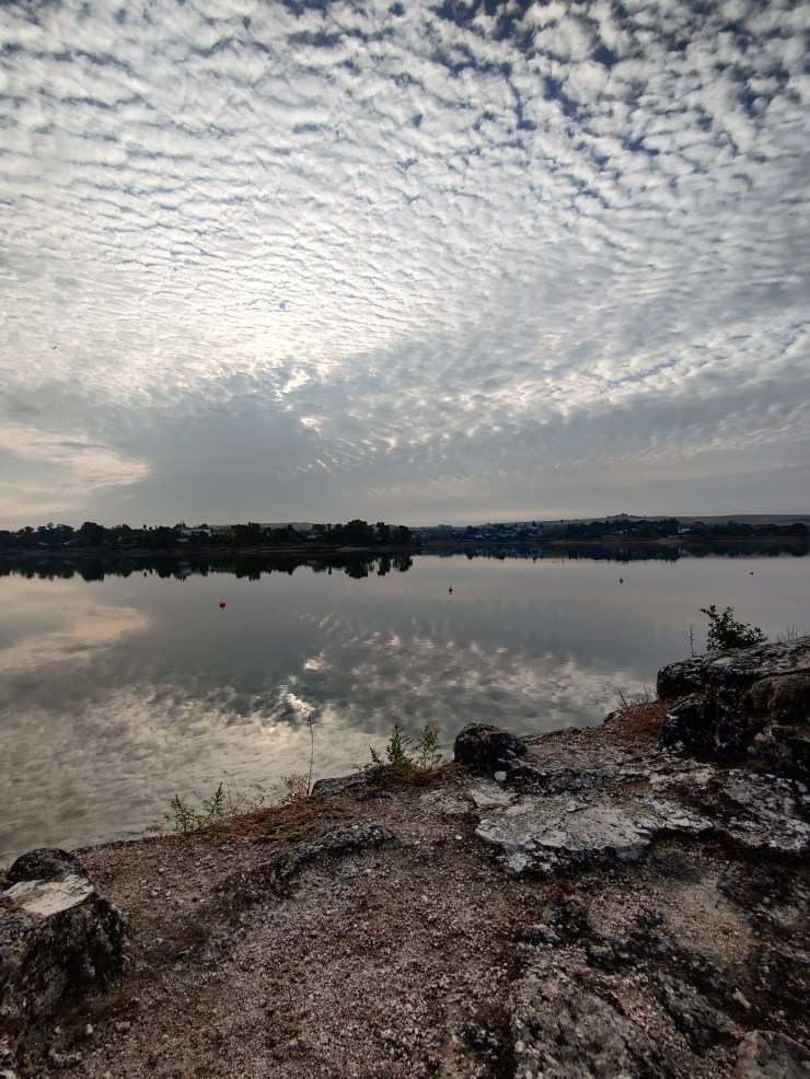 I finally pulled myself away from the aqueduct and began my journey away from the city. The route took me out alongside a tarmac road towards open country and morning commuter traffic. I got excited when I saw two figures ahead of me labouring under heavy backpacks and looked forward to discovering fellow pilgrims, but alas, they weren’t heading in the same direction as me and soon disappeared from sight. The road eventually brought me to Embalse de Proserpina, the body of water that once fed the aqueduct and supplied Mérida 5km away with its water for so many centuries. I paused again, for the second time that morning, to take it all, in and tried to imagine an age so different to our own. My imagination failed me though, and I couldn’t even begin to imagine what life might have been like when the aqueduct was still of vital importance to the city. The water was so calm and still, behaving as a mirror and reflecting the morning cloud perfectly off of its surface. Suffice to say, the tranquillity of the water inspired a dose of tranquillity in my head and so I continued on my journey feeling blessed to be a part of such a glorious morning.