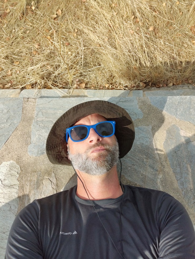 A little while later I found myself at one of very few rest-stops created for pilgrims. So infrequent are they that I’m loathe to ignore them as I pass and feel obligated to enjoy them, simply for the fact that someone has gone to all the effort to create them. Today’s rest-stop was a simple concrete table and benches under a large tree, and I set my pack down, stripped my shoes and socks off and lay flat on the concrete table. The hard surface radiated the days heat against my back, and I closed my eyes, feeling unbelievable comfortable on such an unlikely bed. I had to force my eyes back open after only a few second, knowing full well that if I wasn’t careful I’d surely fall asleep within moments. Such was the restfulness that had overcome me. High above me in the sky I could see hawks or eagles circling and I had to laugh at the thought that it had taken so little time for them to consider me carrion. I imagined their disappointment when they saw me stirring once more and putting my pack back on my back to resume my journey.