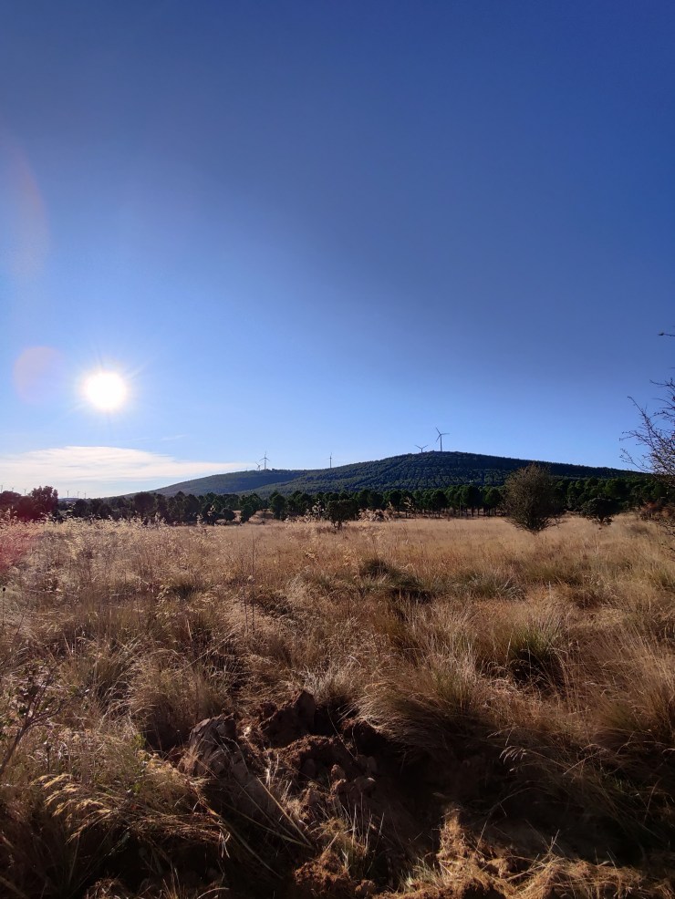 Despite the encroaching threat of Covid that I’d gone to bed with the night before I began my departure from Tábara in high spirits. I left the hotel alone at around 8.30am, and made a leisurely journey away from the village just as the sun was beginning to climb into the sky. The route was lovely and gentle, with rolling green hills breaking up the landscape and deep red soil cushioning each step of my feet. The golden dawn light reflected warmly off of the wind turbines that bordered the path on either side of me and their rhythmic thwarmp, thwarmp, thwarmp lulled my head into a lovely state of calm. Suffice to say, I felt pretty damned good about life, the universe, and everything in between. All things considered.