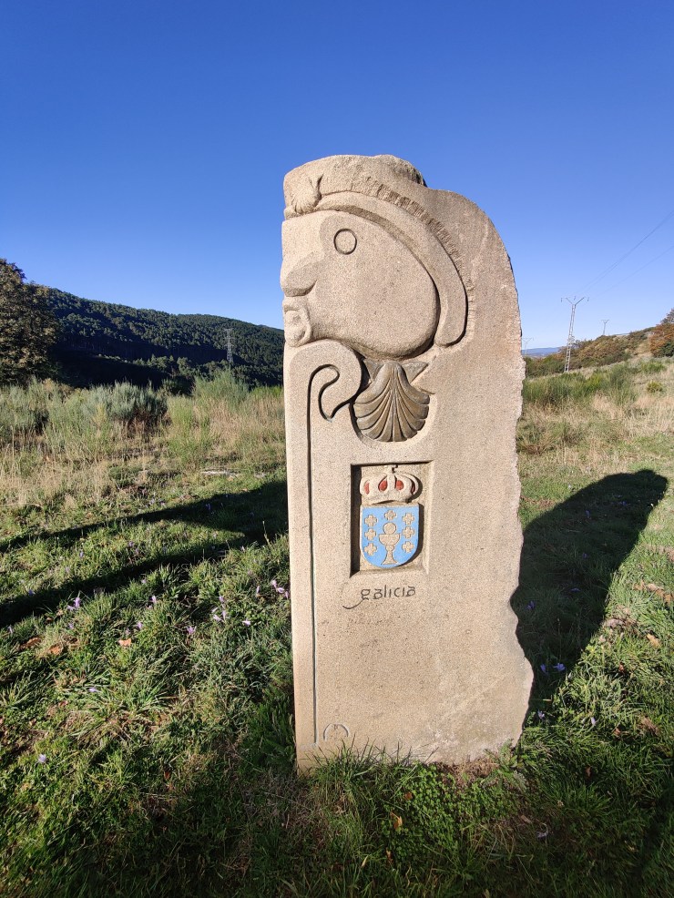 Yes, in leaving Lubián we were also leaving behind Castile y Leon and walking our way into Galicia. The arrival into Galicia meant that we were officially on the home stretch. Well, sort of. There were still another six days of walking ahead of us. But it was a very special moment for the two of us nonetheless, and so we sat to take it all in and contemplate the near completion of our journey. We sat a little longer still, snacking on fruit and chocolate and basking in the unobstructed sunshine that we were now privy to. Our spirits were high, and they grew higher still with the promise of a long, magnificent descent to counter the challenging ascent we’d just completed. And to compliment it further the sky was cloudless and blue, and the sun promised to shine on us for the remainder of the day.