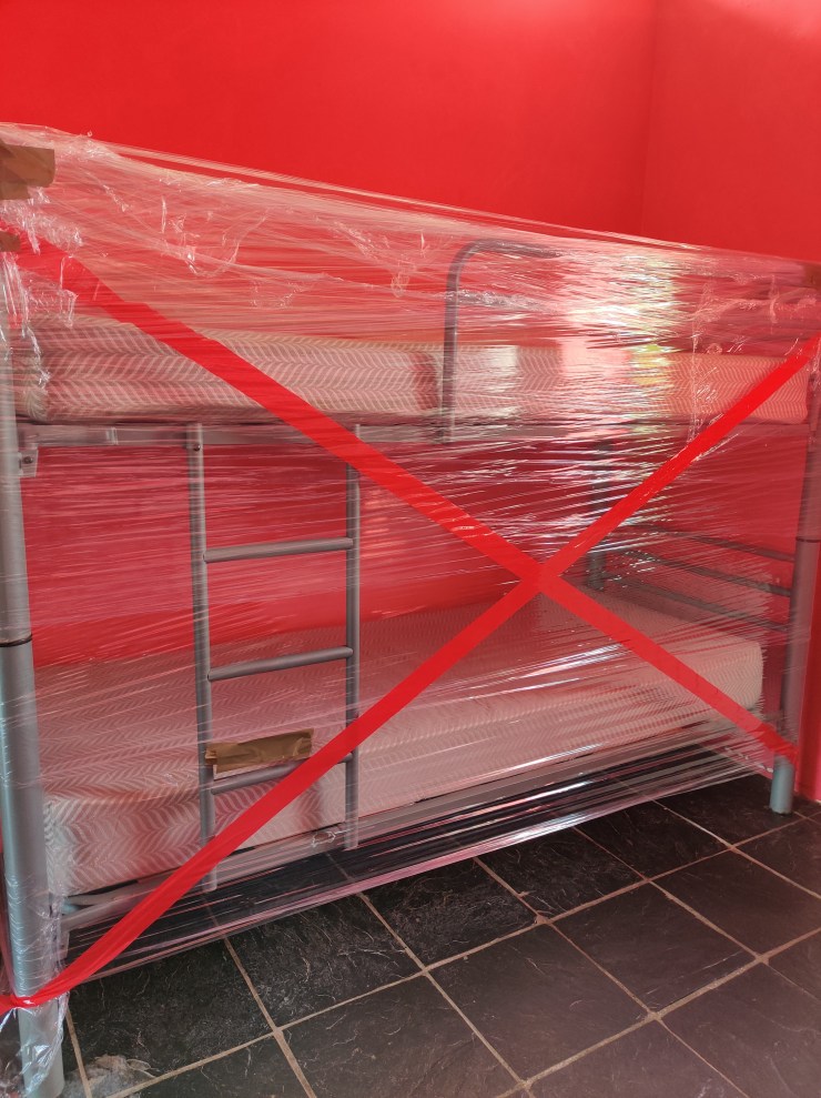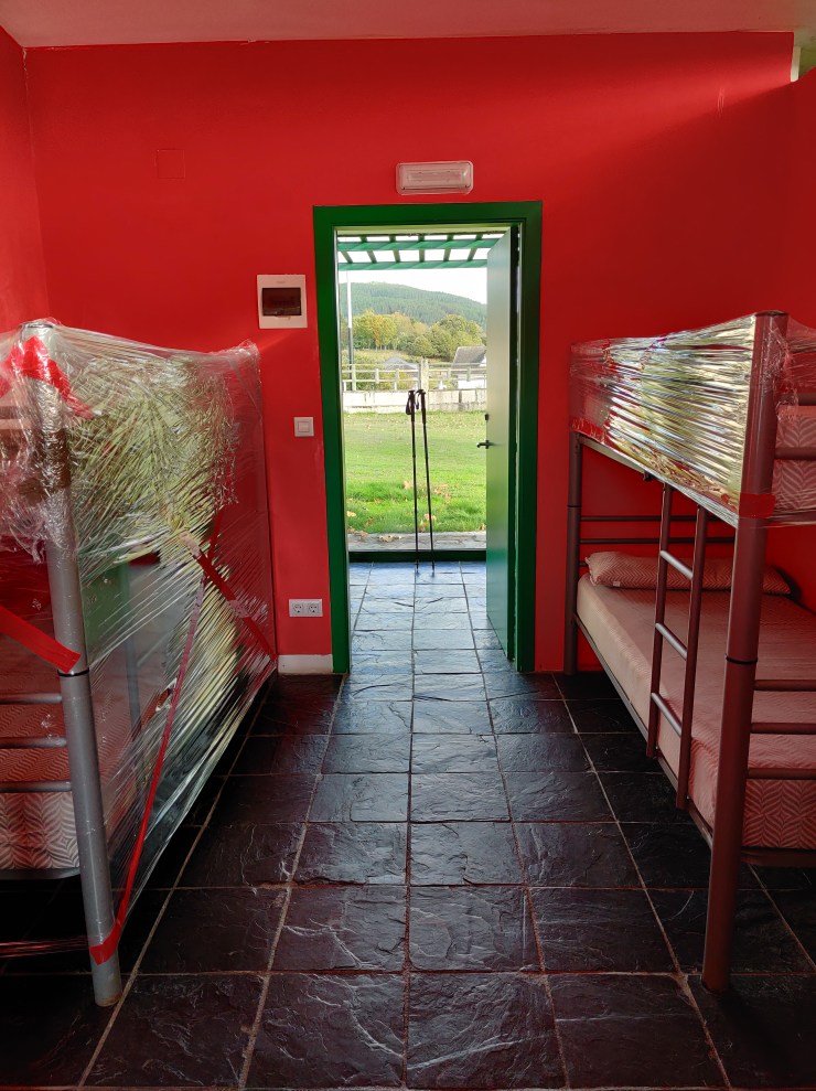 The local albergue was open, and so we paid our €8 to a rather surly man at the local emergency office and collected the albergue key before setting off to find it. It lay on the outskirts of the village and was a modern build consisting of lots of glass walls that riffed off of the overcast sky and created a cold, sterile ambiance within the building. Not even the bright red walls of the dorm could warm it up. Our dorm room consisted of four bunk beds, with all but two beds wrapped methodically with cling-film. Large red X’s had been taped over the surface of the cling-film, to help cement the message that these six beds were off limits to pilgrims. It was an extraordinary sight, perfectly befitting the extraordinary Covid infected world we now found ourselves living in, and it added to the already sterile quality of the albergue. If a hazmat suit had been provided to sleep in I wouldn’t have been the least bit surprised.